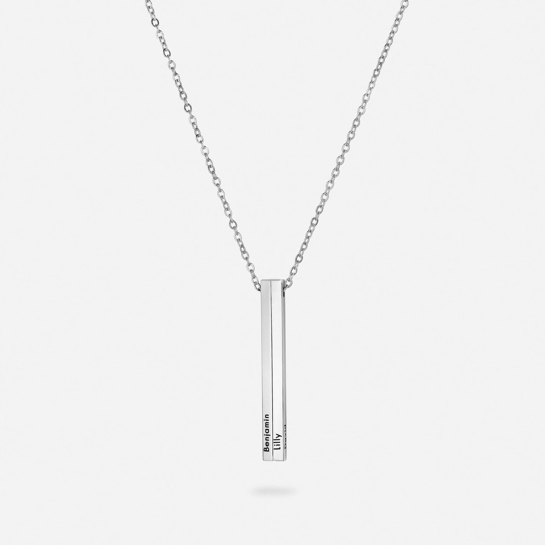 The Vertical Name Necklace can be personalised on up to five sides with names, dates, or words that hold deep significance — creating a timeless symbol of connection, loyalty, and strength.